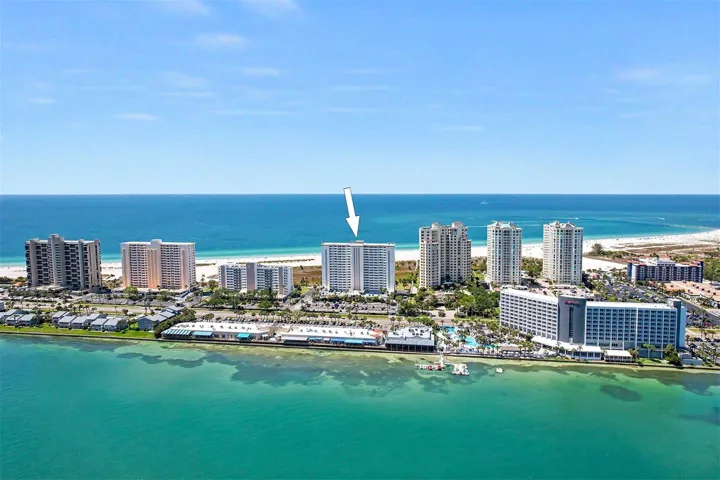 Fully furnished Gulf front condo with a Gulf view from all rooms! Bright and open kitchen area with new appliances. Updated flooring and some new furniture. Large alcove balcony with railings on 2 sides provides extra southern exposure and privacy. Walk-in closet. New electric panel installed in March 2026. Convenient storage locker across the hall from the unit. Desirable assigned under building parking space with plenty of guest parking. Locked & enclosed bicycle racks for owner to use on ground floor, plus outside semi-covered bicycle rack for tenant use. Resort style amenities include large heated pool, hot tub, tennis/pickleball courts, shuffleboard, grilling area, plus a swing set for little ones. Private composite boardwalk leads you to the beach. Proficient on-site management and efficient maintenance and security staff. 24/7 gated security with guard. All Milestone work has been completed. Maintenance fees satisfy SIRS requirements, which reduce the need for future special assessments. Excellent location with restaurants, shops, jet ski & boat rentals across the street. Short walk or drive across Clearwater Pass to Clearwater Beach activities. This move-in ready unit is ready to be enjoyed as a permanent residence, seasonal getaway or income producing beach gem. Enjoy truly carefree beach living at its best!!!