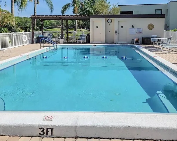 Enjoy an abundance of natural light from sliding glass doors that look out over the manicured grass, pine trees and COMMUNITY POOL. The The generous living and dining area flows seamlessly to a screened lanai with desirable southeast exposure, perfect for relaxing or enjoying your morning coffee.