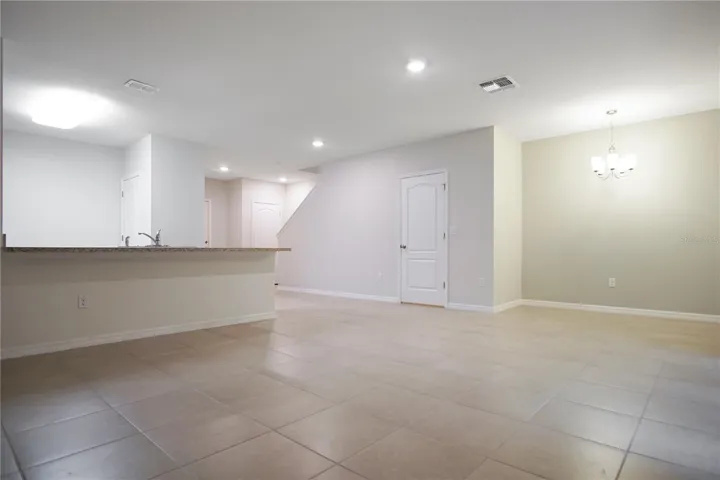 The spacious living area, adorned with natural light, includes a thoughtfully placed half bathroom for guests’ convenience. The dining room and living room combination provides ample space for entertaining, with a sliding door leading to the exterior of the home where you’ll discover a screened-in patio, perfect for enjoying the Florida weather.