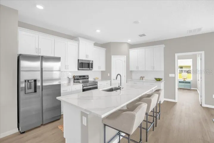 One or more photo(s) has been virtually staged. Under Construction. One or more photo(s) has been virtually staged. Under Construction. New Construction complete, The Sugarloaf. This 4-bedroom, 3-bath home—available with a 2-car garage—offers a wide-open floor plan filled with natural light and enhanced by soaring vaulted ceilings. A welcoming covered entry and a spacious covered lanai extend your living space outdoors, perfect for enjoying Florida’s warm breezes. This home includes the features you’ve been looking for. You will find luxury vinyl plank and ceramic tile flooring throughout the home, 8-foot doors, 5 1/4-inch baseboards, a landscaped yard with irrigation, an interior laundry room and a garage door opener. The kitchen is a cook’s dream where you will find solid surface counters with a tile backsplash, custom cabinets featuring 42-inch upper cabinets as well as soft close doors and drawers, stainless-steel appliances, and a generous pantry. The large primary suite is a true retreat, ceramic tiled shower, dual sinks, and a private commode room. This floorplan features dual walk-in closets for exceptional storage and comfort. Many more fabulous features are also included. Our homes are designed with craftsmanship you can see and quality you can feel. This home blends style, functionality, and lasting value. You don’t want to miss seeing this one.