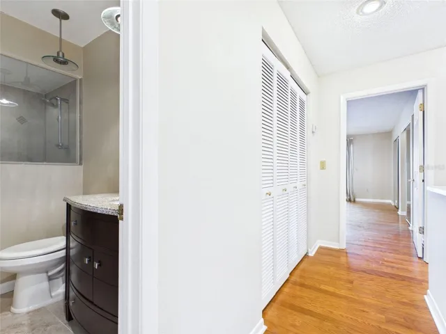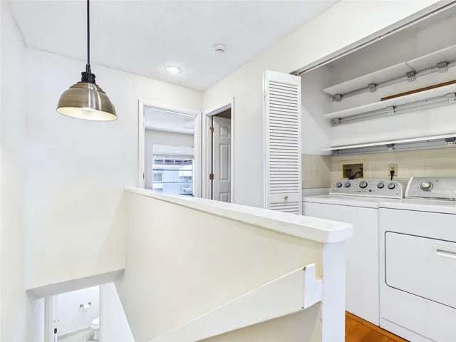 Upstairs, the primary bedroom includes its own balcony with partial water views, along with an ensuite bathroom featuring a large walk-in shower and double sink vanity. The second bedroom is positioned on the opposite side for privacy and includes its own bathroom, ample closet space, and a built-in Murphy bed for quick transformation from office to a great guest bedroom. From this room, enjoy fantastic water views overlooking the pool, docks and the canal. A full-size laundry area is conveniently located on the bedroom level.