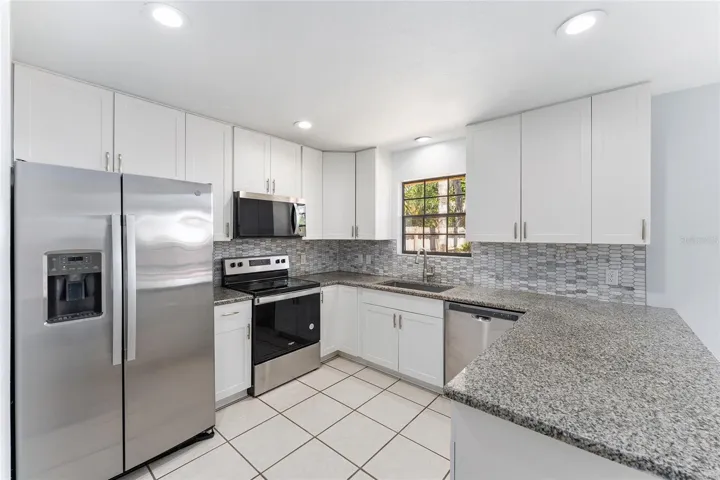 42” white wood cabinets, granite counters, and stainless-steel appliances purchased in 2025. Cozy living