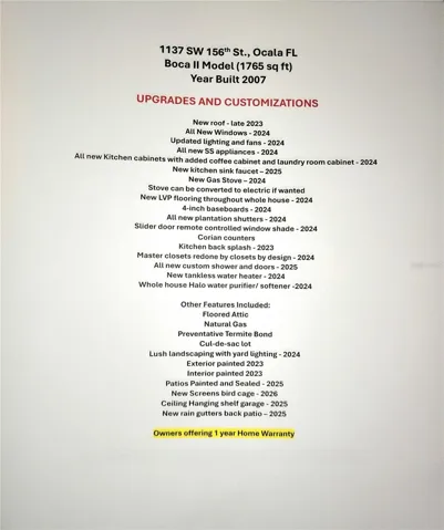 SUMMERGLEN GOLF COURSE COMMUNITY Lot 535. THIS HOME IS A MUST SEE! As soon as you walk in the front door it is a light and bright home and you just feel like you are in Florida! Before reading any further you need to read the attached UPGRADES and CUSTOMIZATIONS sheet. Or find it amongst the pictures. Too much to enter here. Here are a few of the upgrades: NEW ROOF-late 2023, ALL NEW WINDOWS-2024, Updated LIGHTING AND FANS-2024, ALL NEW SS APPLIANCES-2024, ALL NEW KITCHEN CABINETS with added coffee cabinet and laundry room cabinet-2024, NEW LVP FLOORING-2024, 4-inch baseboards-2024, ALL NEW PLANTATIONS SHUTTERS-2024, Master closets redone by closets by design-2024, All new custom shower and doors-2025, NEW TANKLESS WATER HEATER-2024, Whole house Halo water purifier/softener-2024. The list of charm and character that has been added to this home could go on and on, but it just needs to be seen and experienced in person to take it all in. The OWNERS have gone way above and beyond with upgrades and this home is priced to sell. Not only is this home beautifully kept and updated, but the community of SummerGlen is full of every activity possible. SUMMERGLEN is located Minutes from I-75 and The Florida Horse Park, close to The Villages, and the Town Squares, while still feeling like it is secluded and private. SUMMERGLEN Has a 18 Hole Golf Course and Golf Shop. HOA fee includes mowing/edging of yard, garbage pickup including recycling, Spectrum Bronze Tier 1 TV and 100 Mbps internet, as well as access to all amenities. Did I mention ALL of the community amenities? All this and more located in an active, gated community featuring club house with lounge area, space for future restaurant and meeting rooms, tons of activities & 70 clubs plus bocce ball, pickleball, tennis courts, softball, heated pool & spa, RV parking, dog parks, and tons more! All of that along with a $30 food and beverage Credit to be used at the new Community Restaurant, “Tavern at the Glen”. Owners are offering a 1 year home warranty for buyer’s peace of mind.