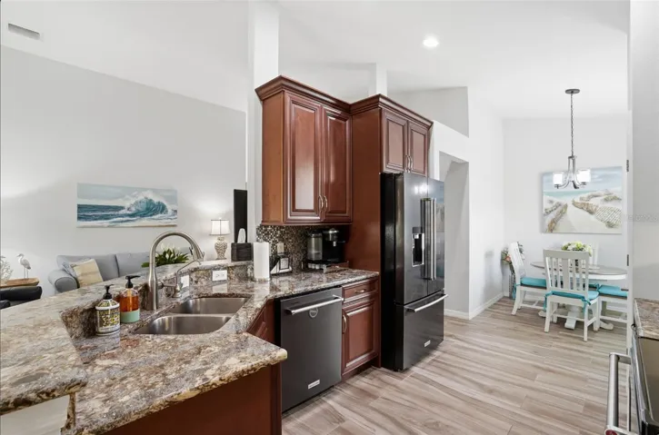 The kitchen is thoughtfully designed and updated with rich wood cabinetry featuring soft-close drawers, granite countertops, custom tiled backsplash, roll outs, and premium KitchenAid appliances—perfect for both everyday living and entertaining. A versatile third bedroom provides flexible use as a home office or guest space, complete with granite top desk with built-ins, a Murphy bed with adjacent wardrobe cabinetry. Impact glass windows & doors along with accordion hurricane shutters.