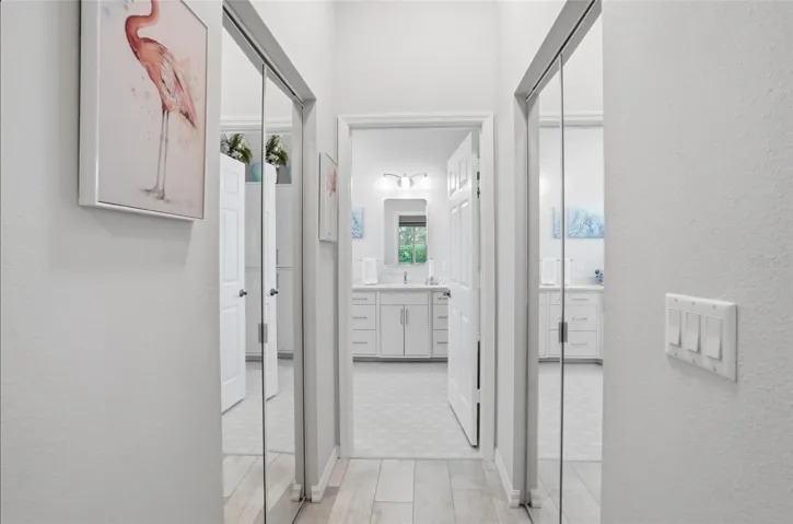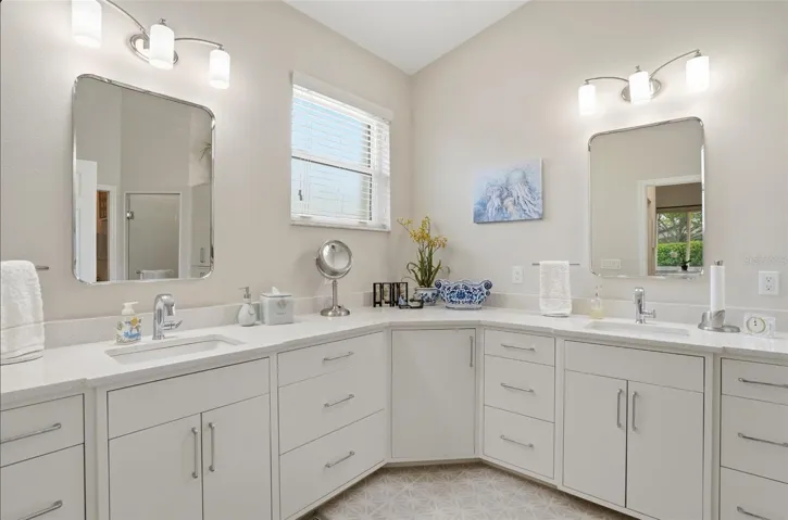 Primary bathroom completed remodeled with custom cabinetry, quartz countertops, dual vanities, frameless shower, lighting, plumbing fixtures, and more. The secondary bathroom has been tastefully updated with custom cabinetry, quartz countertops and stylish lighting, while tile flooring flows seamlessly throughout the home. The oversized screened lanai and private back yard offers the ideal setting for morning coffee or evening relaxation and entertaining.