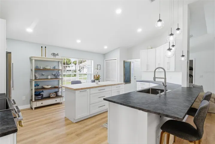 The spacious owner’s suite offers a walk-in closet and a tastefully updated en-suite bath. Enjoy year-round Florida living on the screened-in porch overlooking the water, ideal for relaxing or hosting guests. The extended garage provides additional storage or workspace, adding even more functionality to the home.