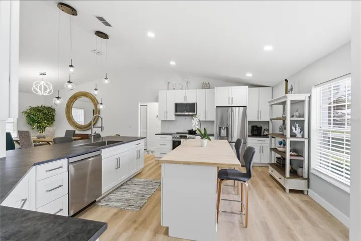 Charming 3-bedroom, 2-bath, 2-car garage concrete block home situated on a desirable corner lot with serene water views in the Woodlake subdivision of Port Orange. This beautifully updated residence features a bright open-concept floor plan with vaulted ceilings and a split-bedroom layout for optimal privacy.