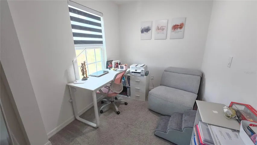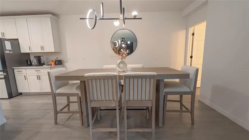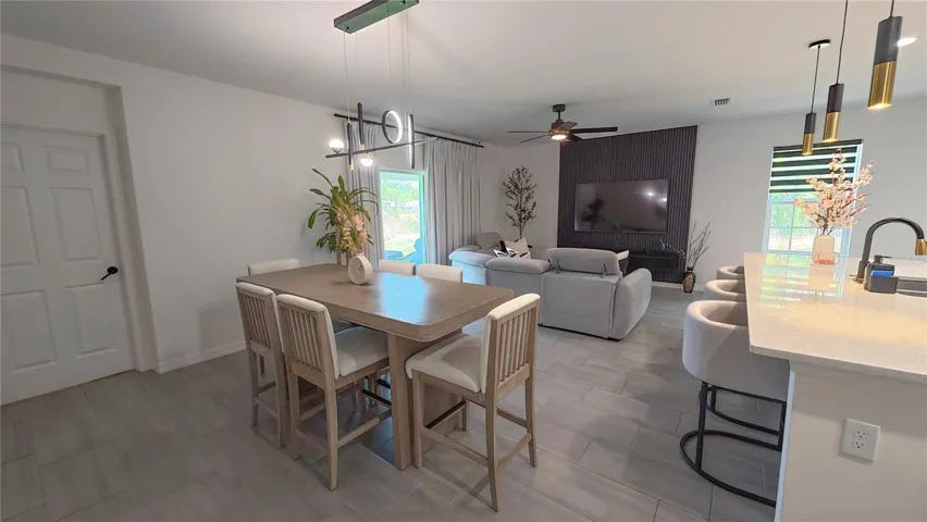 The first floor features a bright open-concept layout that connects the great room, dining area, and kitchen, creating a comfortable flow for everyday living, remote work, and entertaining. The kitchen offers beautiful cabinetry, solid-surface countertops, stainless steel appliances, and a clean modern feel. Tile flooring throughout the main living areas adds durability and easy maintenance, while sliding doors lead to a covered rear lanai, perfect for enjoying your morning coffee, relaxing outdoors, or spending a quiet evening in the Florida breeze.