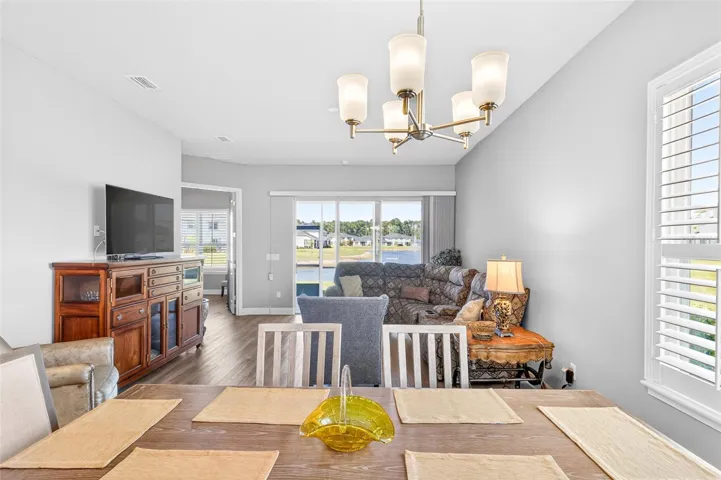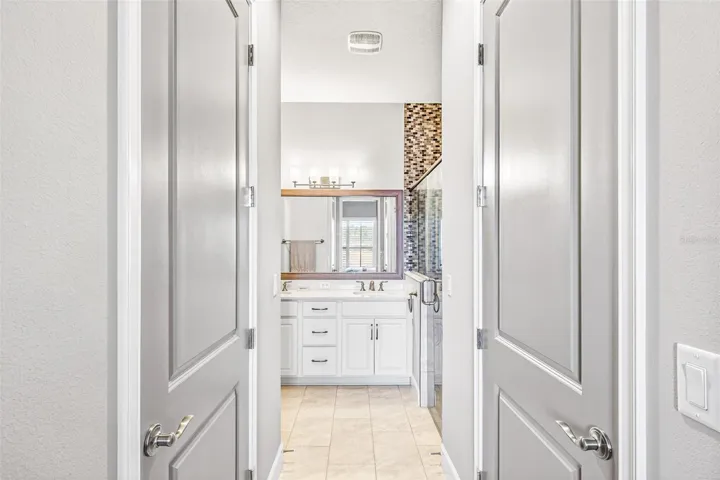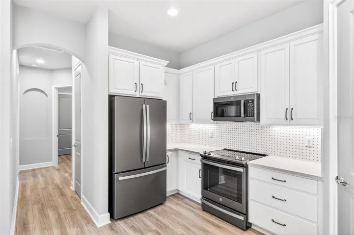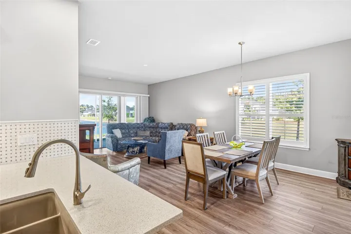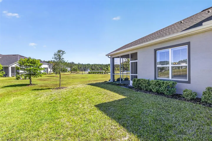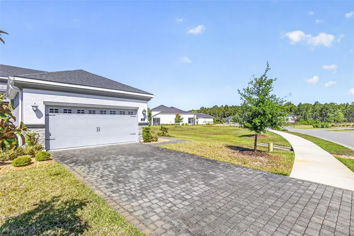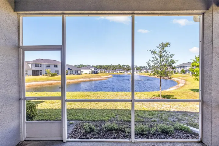 One or more photo(s) has been virtually staged. Picture-perfect pond and fountain views frame nearly every room of 10 Newhaven Lane, a beautifully appointed 2-bedroom, 2-bathroom Westlake townhome with a versatile flex room / bonus room, set behind the 24-hour manned gates of Plantation Bay Golf & Country Club in Ormond Beach, FL 32174. Built in 2021 with concrete-block-and-stucco construction, ENERGY STAR-qualified windows, a heat pump system, and a whole-house water softener, this 1,529-square-foot single-story home delivers true lock-and-leave Florida living without sacrificing style. Inside, an open great-room layout flows seamlessly between the kitchen, dining area, and living room, where a sectional sofa faces sliding glass doors that open to a sparkling community pond and fountain—an everyday view most buyers only dream of. The chef-friendly kitchen anchors the heart of the home with crisp white shaker cabinets, quartz countertops, a coordinating tile backsplash, stainless steel appliances including a French-door refrigerator, an undermount double sink, and ample prep space for entertaining. Plantation shutters and pendant lighting elevate the dining area, while wood-look tile flooring runs continuously through the main living spaces for easy upkeep. The flex room flexes hard: photographed once as a comfortable sitting room with a loveseat and armoire, and again as a polished home office with a writing desk framed by an arched entry—use it as a guest suite, gym, hobby studio, or den. Behind elegant double doors, the split-plan primary suite features a serene bedroom, two walk-in closets, and a spa-inspired ensuite with a dual-sink quartz vanity, framed mirrors, a designer mosaic-tile accent wall, an oversized walk-in shower with frameless glass, and a private water closet. A guest bedroom with plantation shutters and a full hall bath with a tile-surround tub-shower combo welcome visitors in style, and a dedicated laundry room with front-load washer and dryer plus storage cabinetry adds everyday convenience. Outside, a screened lanai stretches across the rear elevation, opening to direct views of the lake, fountain, and lush community lawns, while the two-car attached garage with paver driveway completes the curb appeal. The HOA covers irrigation, lawn care, landscaping, and roof maintenance, freeing residents to enjoy Plantation Bay’s optional club memberships unlocking 45 holes of championship golf across Prestwick, Club de Bonmont, and the North course, a brand-new 40,500-square-foot Golf and Lifestyle Center, two resort-style pools, a 7,000-square-foot spa and fitness complex, 10 Har-Tru tennis courts, 10 pickleball courts, bocce, basketball, miles of bike-and-walk trails, and on-site dining. Zoned for Pathways Elementary, Ormond Beach Middle, and Seabreeze High, with Granada Boulevard’s shops, Frappes North, Lulu’s Oceanside Grill, and the world-famous hard-packed sands of Ormond Beach roughly 10 miles east via I-95, plus 15 minutes to Daytona Beach International Airport, 30 minutes to historic St. Augustine, and 60 minutes to Orlando, this turnkey Plantation Bay townhome offers buyers searching for homes for sale in Ormond Beach 32174, gated golf-community living, water-view properties near top-rated schools, or a maintenance-free Florida retreat the rare combination of newer construction, resort amenities, and that unforgettable pond-and-fountain backdrop—schedule your private tour and experience why 10 Newhaven Lane sets a new standard for coastal Ormond Beach living.