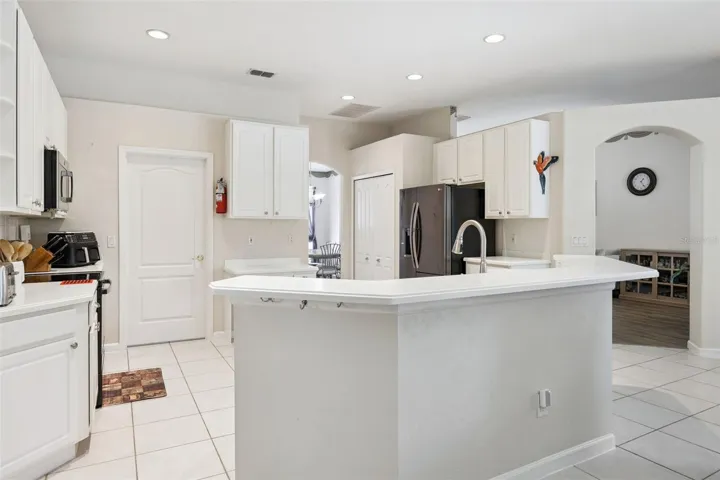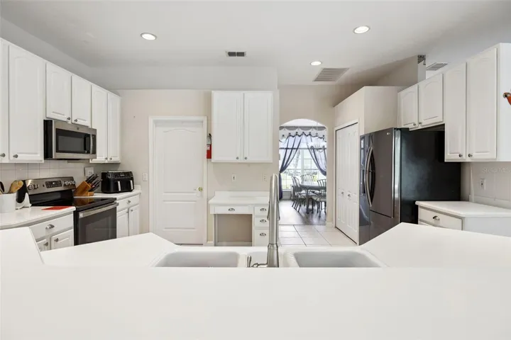 The kitchen family room area is bright and very spacious with lots of countertop space, ample cupboards and a very handy desk area… perfect place for your cookbooks.. there is also a dining area overlooking the pool deck and a very convenient breakfast bar. This floorplan makes a great entertaining house with the kitchen & breakfast nook overlooking the living area and very easy access to the pool deck.